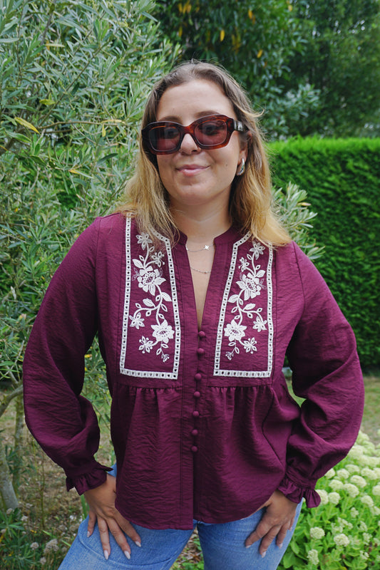 Blouse bordeaux broderies fleurs PETIT DÉFAUT