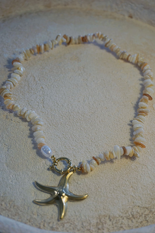 Collier doré pierres crème et étoile de mer