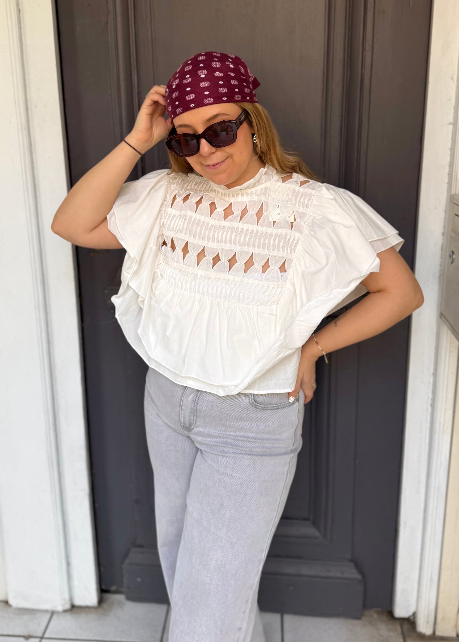 Blouse blanche à volants ouvertures losanges