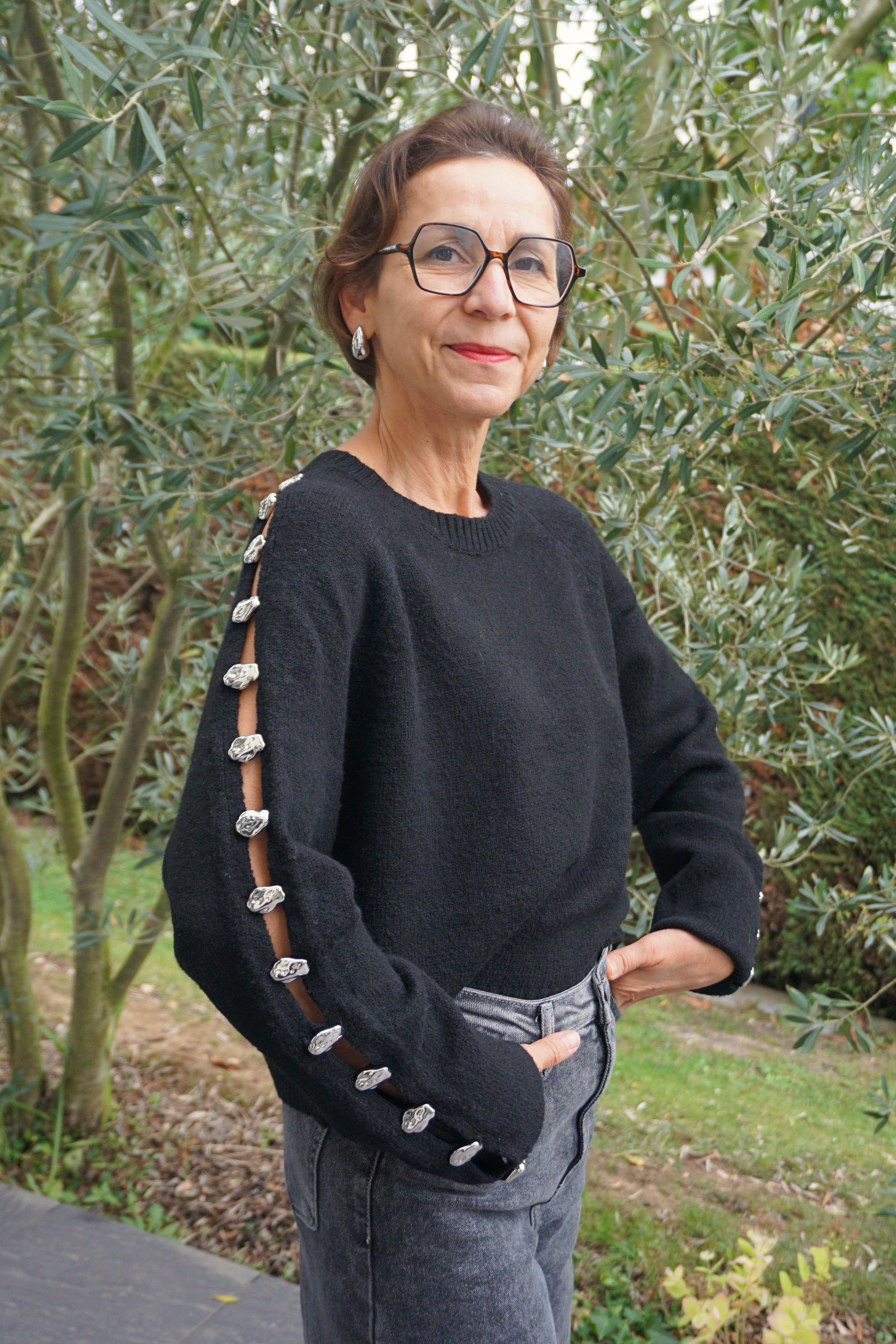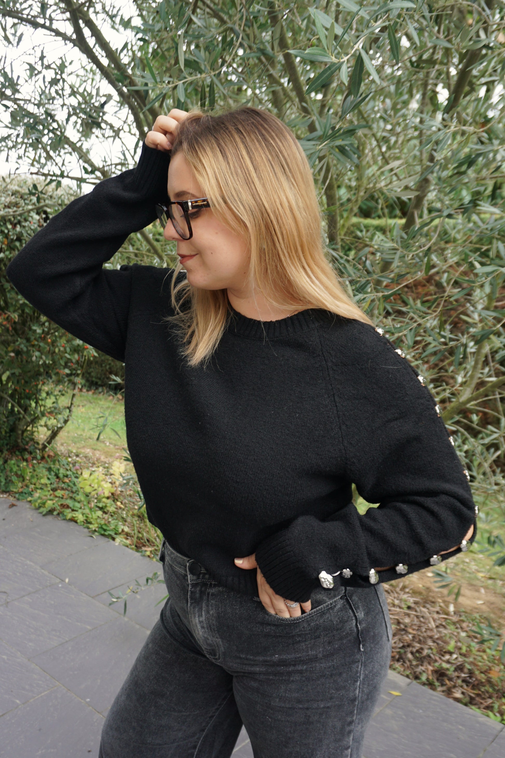 Pull noir ouverture bijoux argentés