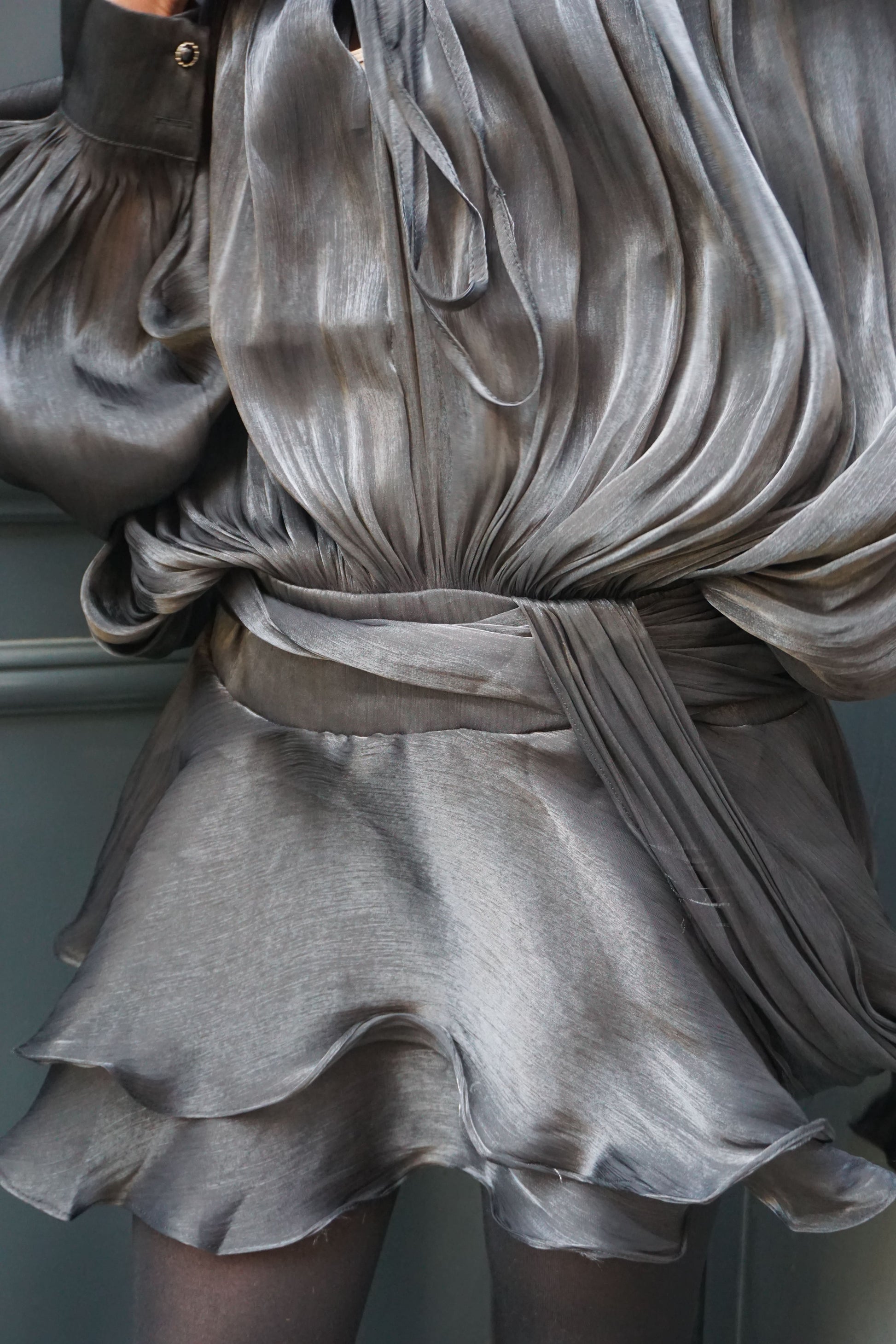 -Haut bouffant et drapé sur le devant, fermeture du col par petits liens, matière brillante