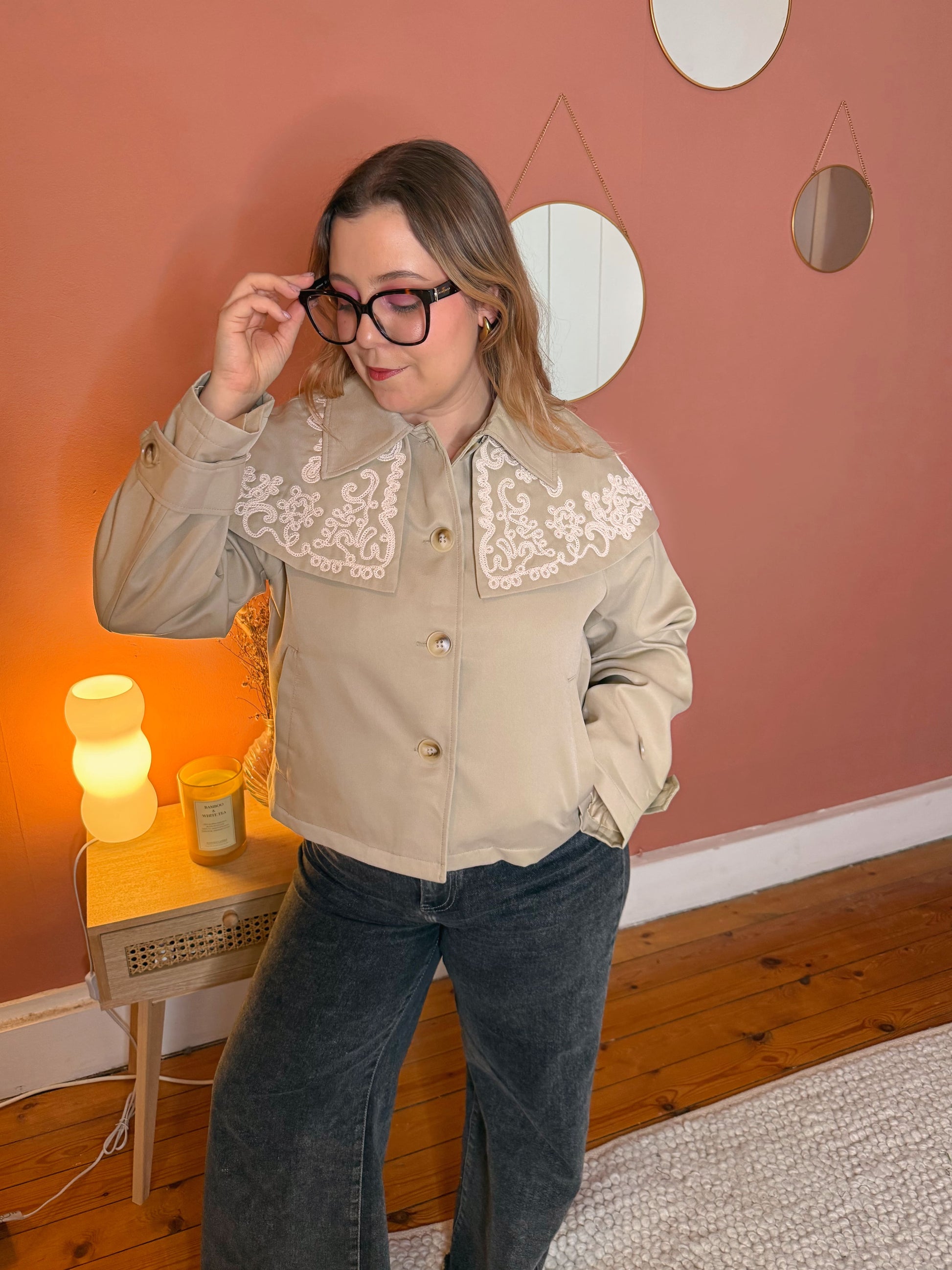 Veste trench beige col volant brodé